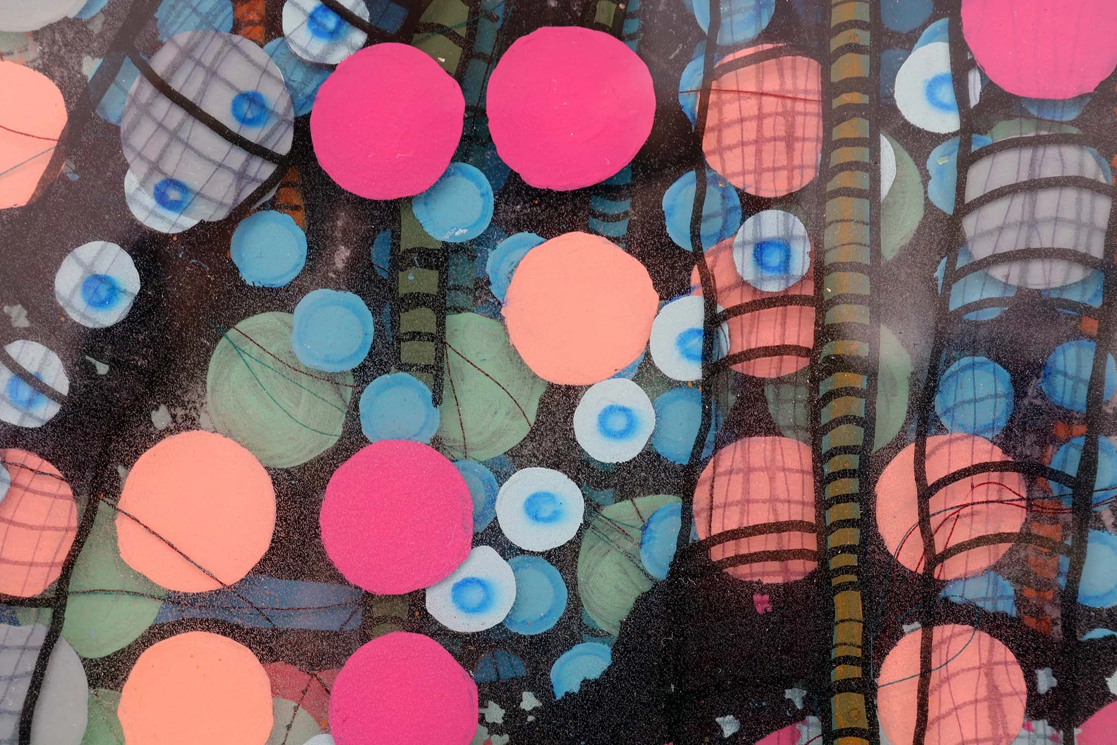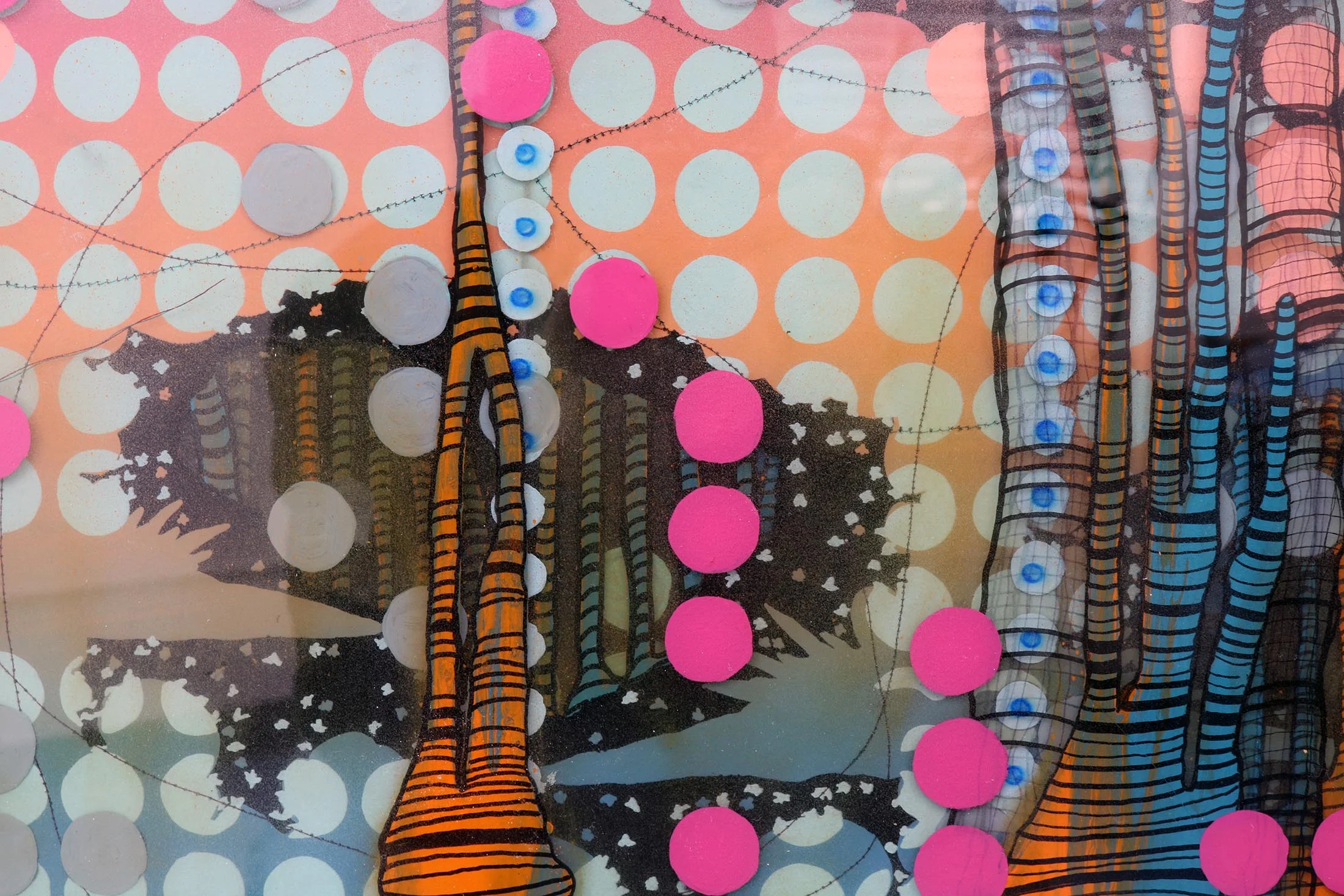 (Screen Print, Machine Stitching, Acrylic, Enamel, Markers Embedded in 5 Layers of Resin)