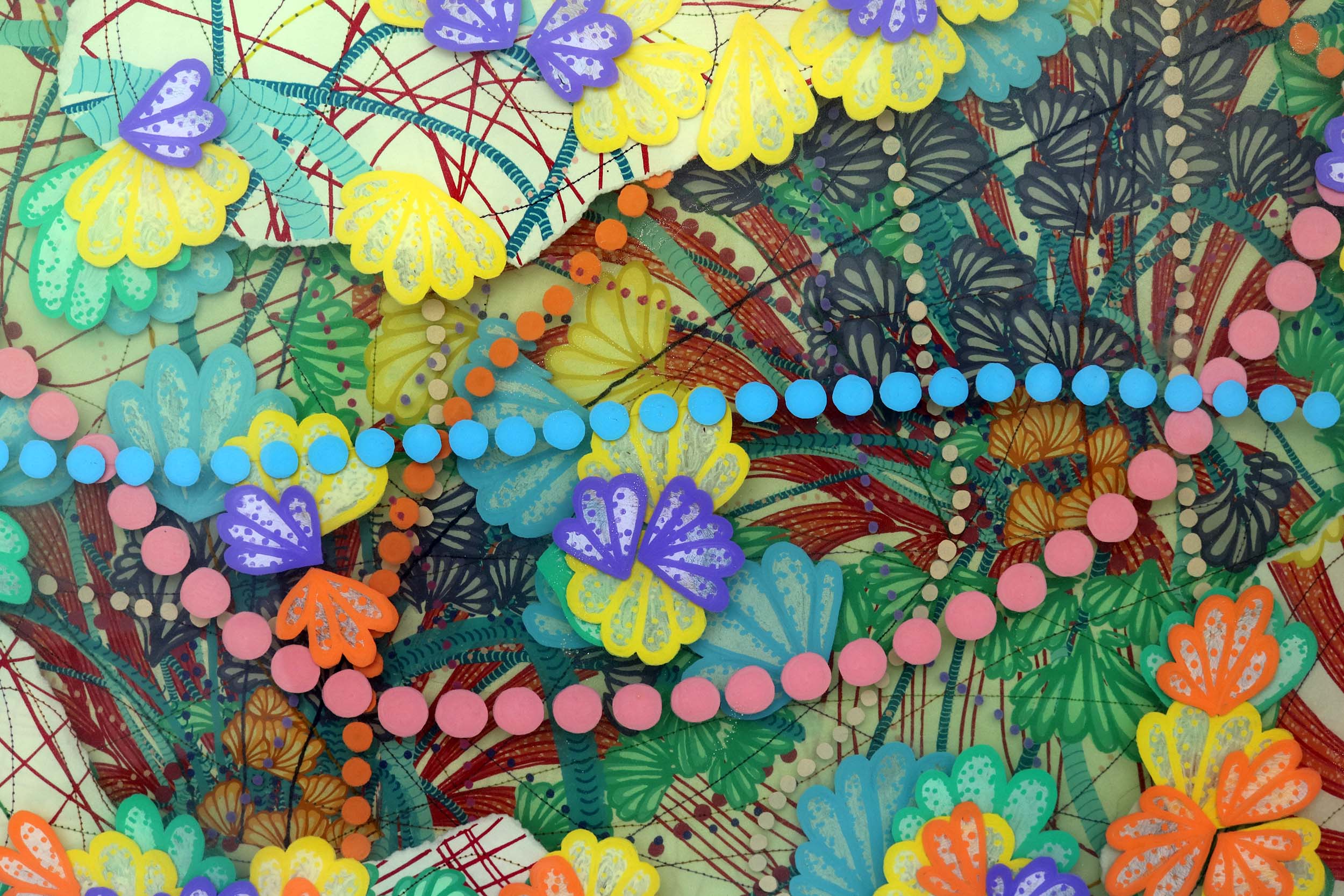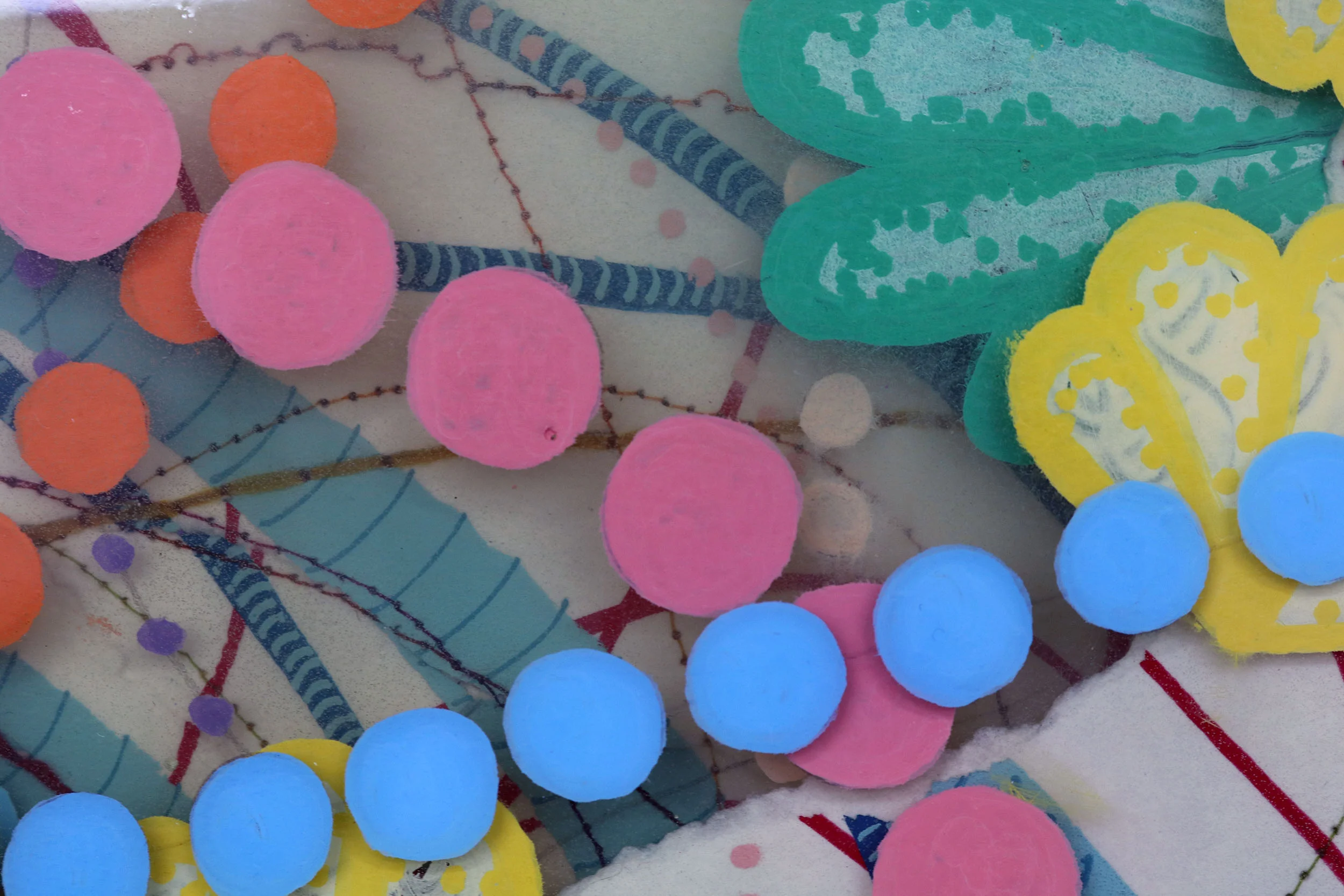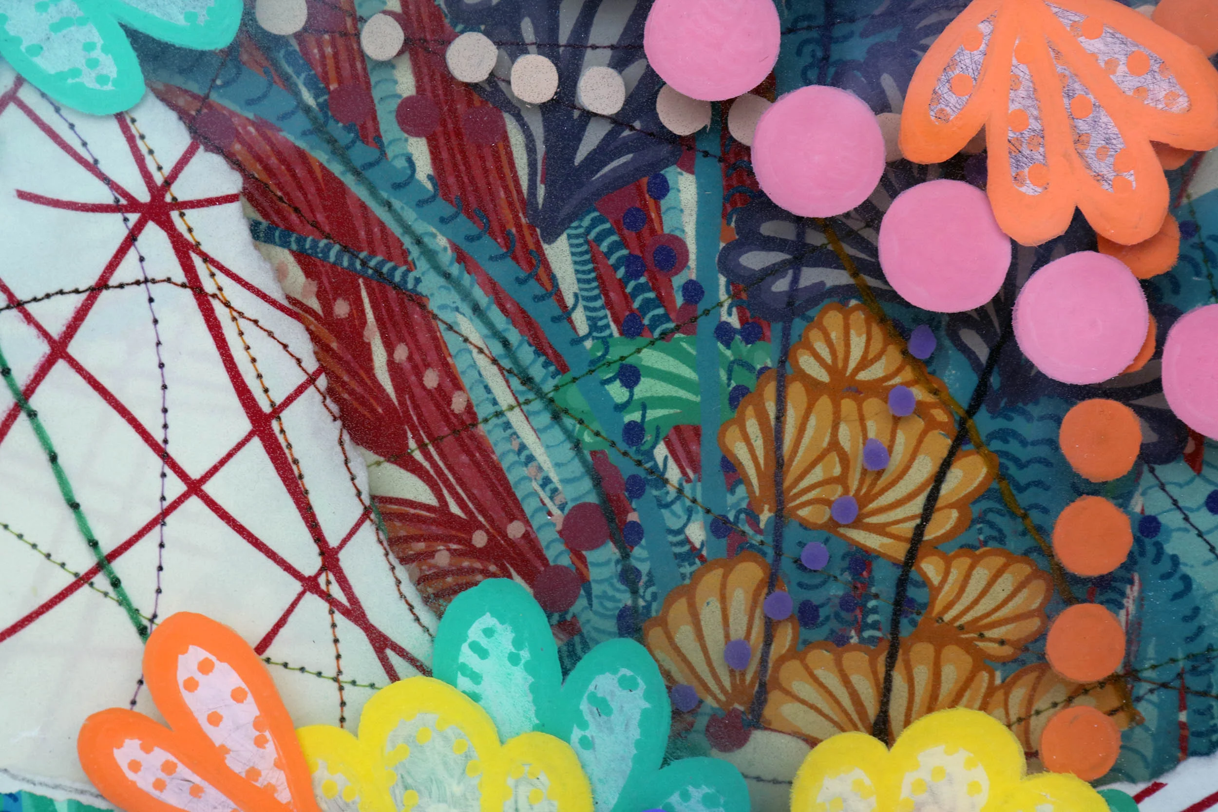 (Screen Print, Machine Stitching, Acrylic, Enamel, Markers, Embedded in 8 Layers of Resin)
