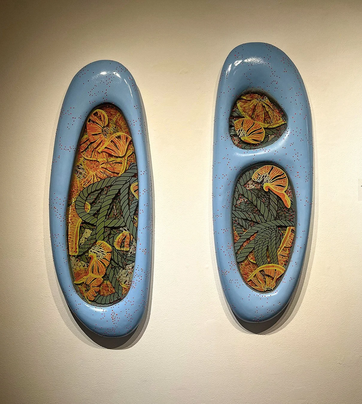 (Carved Foam, Canvas, Modeling Paste, Resin, Screen Printing on Stonehenge Paper, Machine Stitching)