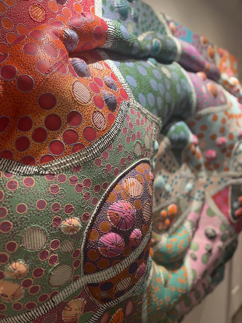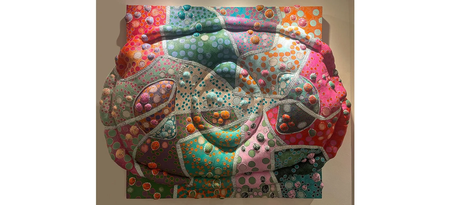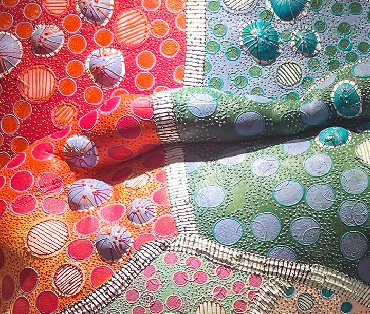 (Quilted and Batted Canvas, Stamping, White Stretched Polyester, Fiberfil, Power-tex, Acrylic Paint)